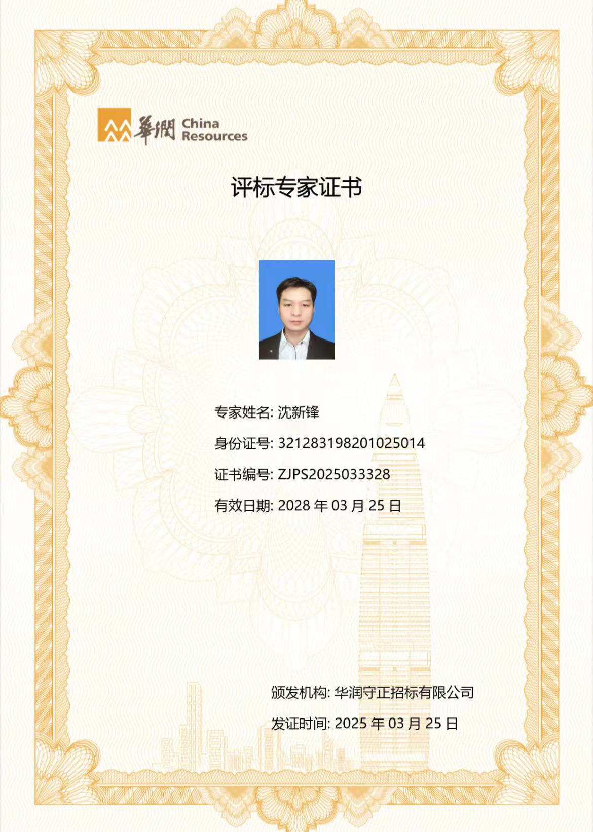 热烈祝贺,四川省中科天睿科技研究院院长,帕辛蒂慕科技(江苏)有限公司总经理沈新锋荣获华润守正评标有限公司评标专家